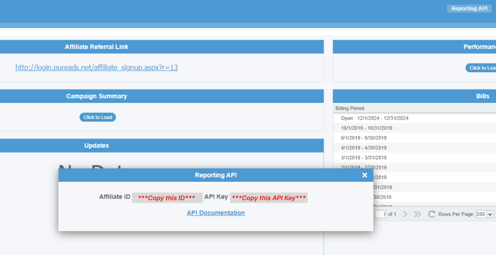 ¶ 2. Then click Reporting API in the top bar. This will open a popup with your Affiliate ID and API Key; copy these: