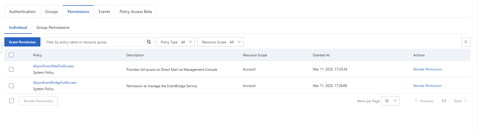 Add “AliyunDirectMailFullAccess” and “AliyunEventBridgeFullAccess” permissions.