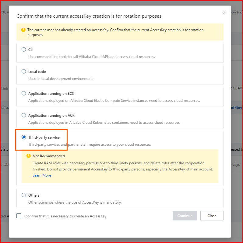 Under the “Authentication” tab for the new User, select “Create Access Key”; choose the “Third-party service” option and continue following the prompts, ensure to take note of both the Access Key and Access secret as you will not be able to view the pair again (you would have to generate a new Key/Secret pair if you don't or if you lose this one).