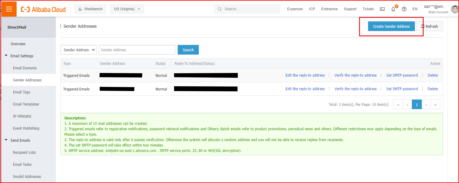 Click “Create Sender Address” and add an email with the domain you just set-up in the previous step and set the Type to “Triggered Emails” or “Batch Emails” , and add a valid Reply-To address. Triggered emails refer to registration notifications, password retrieval notifications and others; Batch emails refer to product promotions, periodical news and others