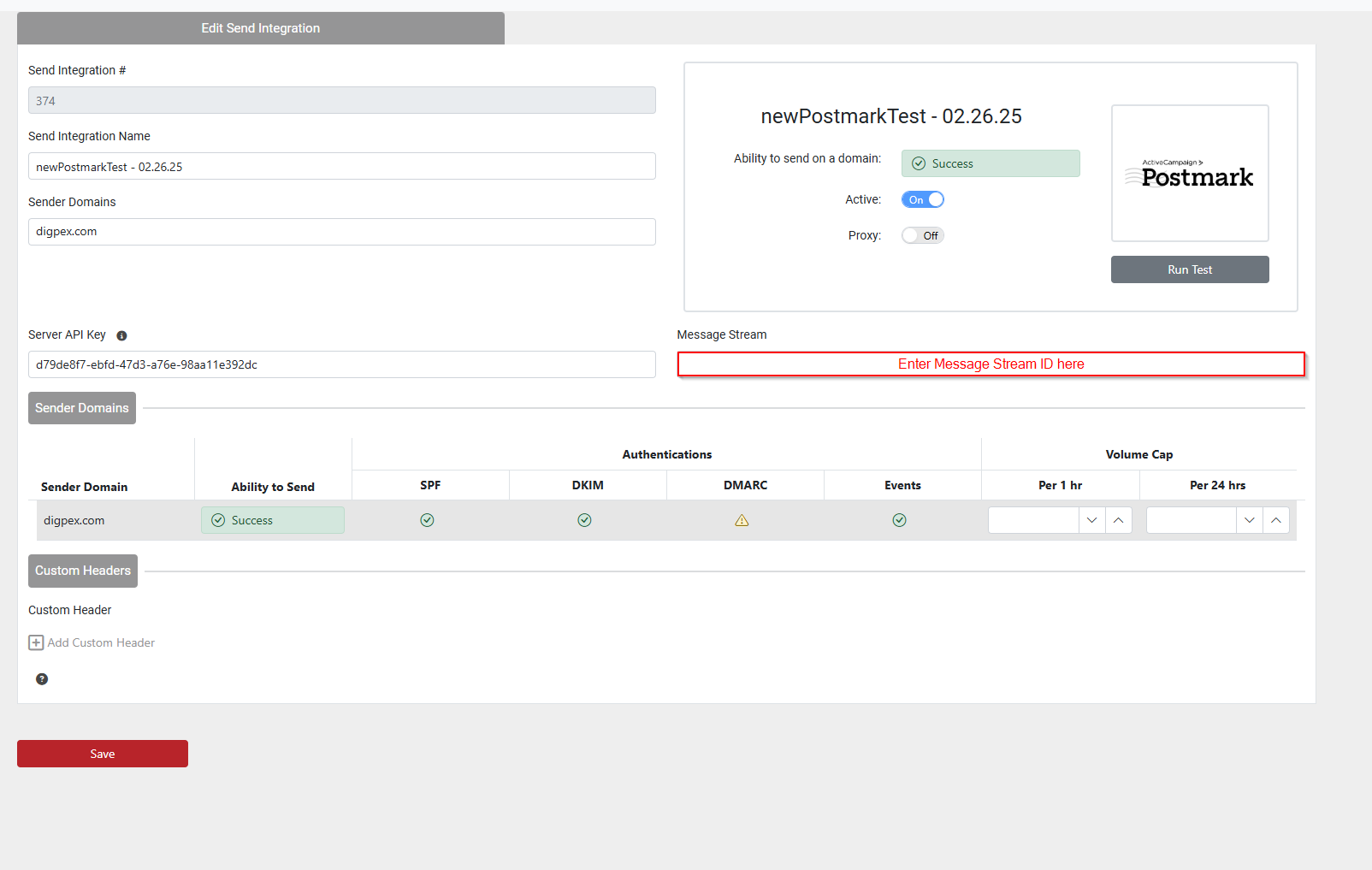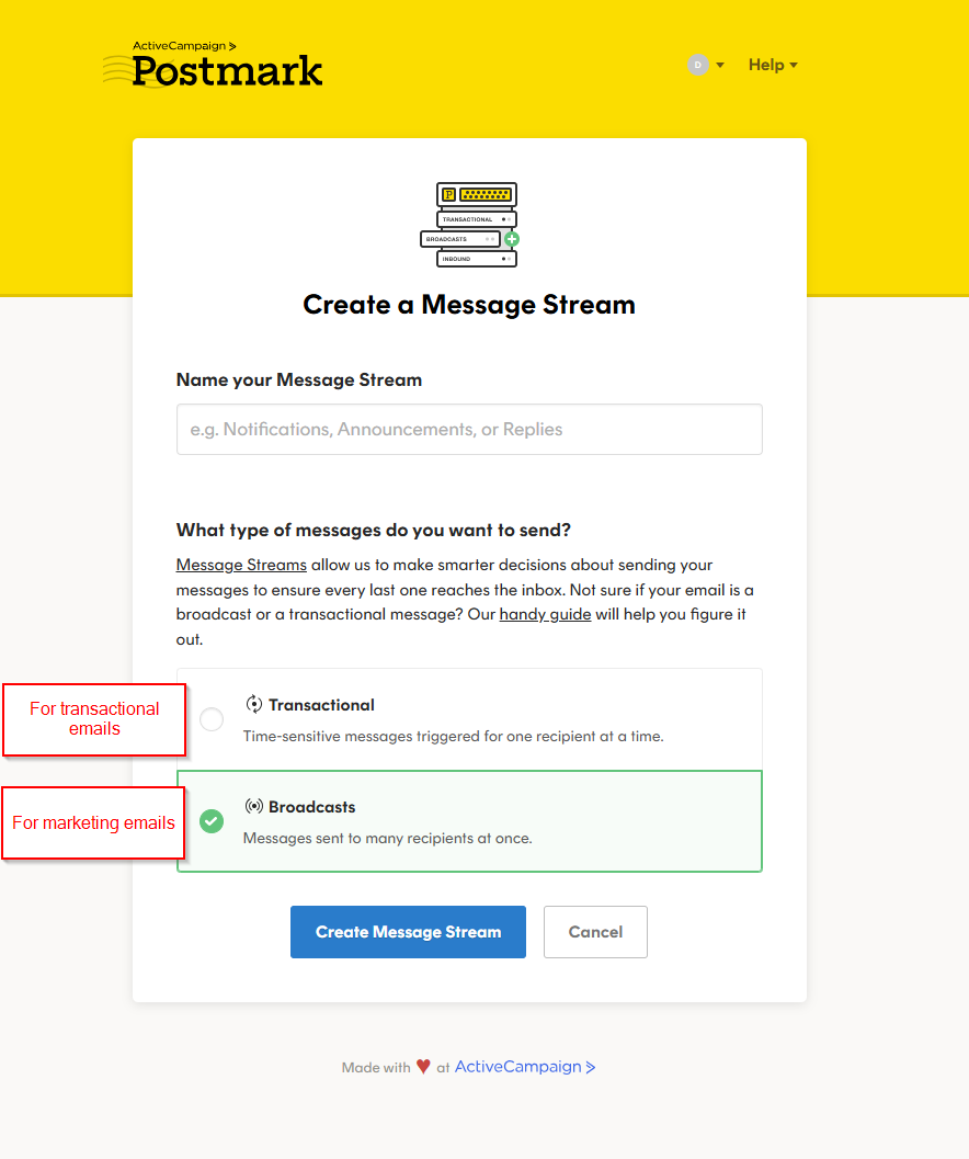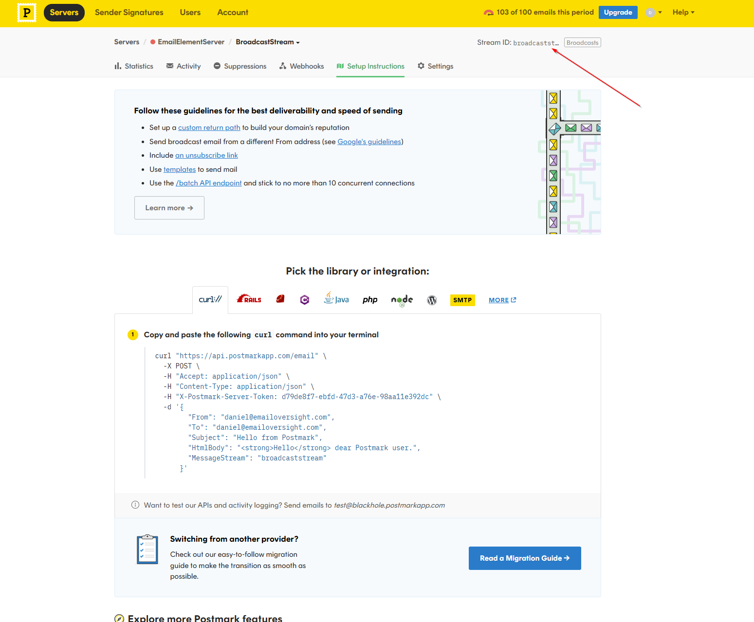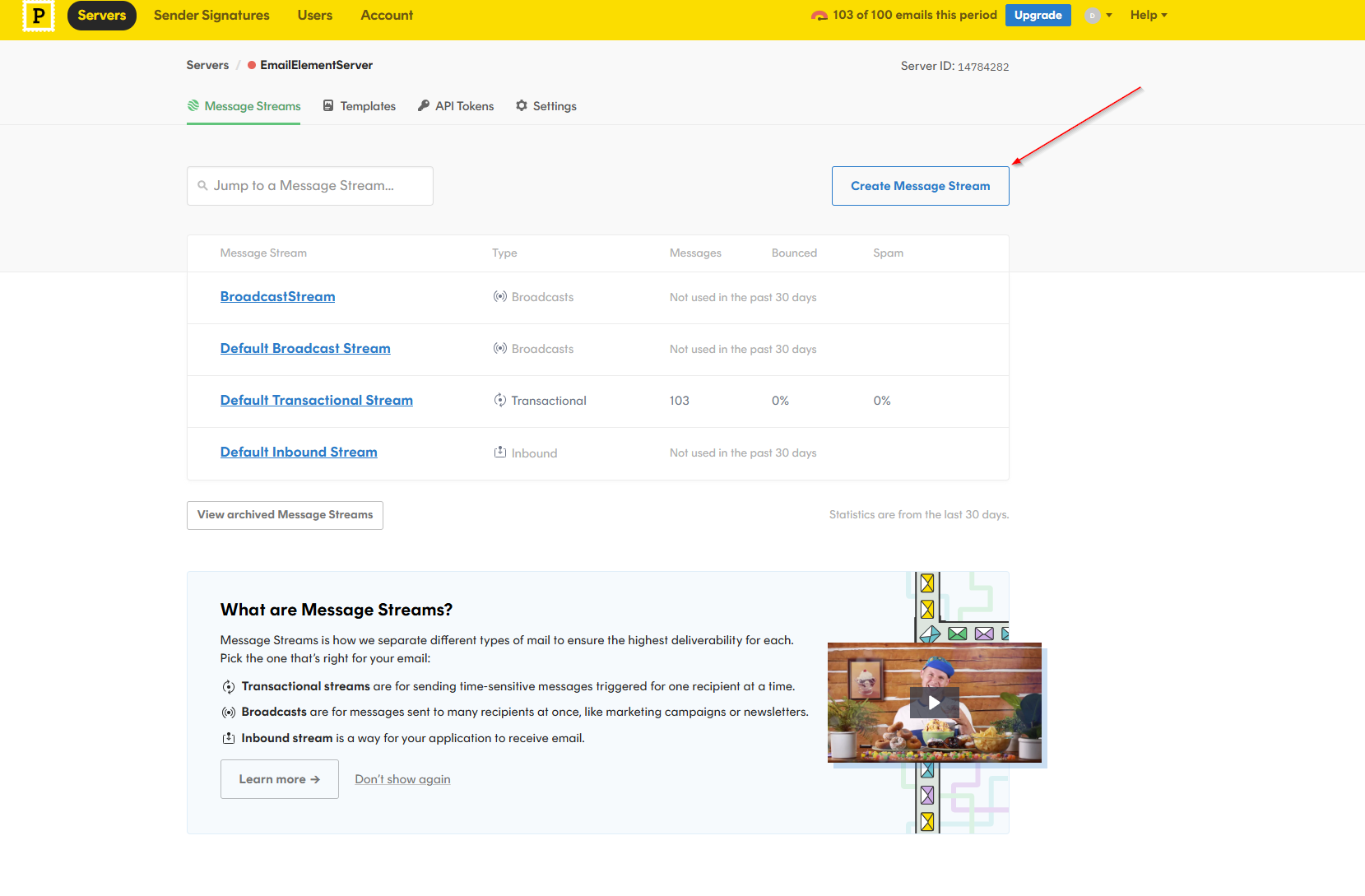 Back in EmailElement, enter your Message Stream ID here in the “Message Stream” field when setting up your Sender Intergration: